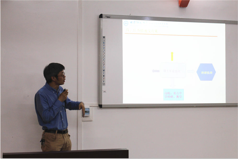 唐东升教授从湖南师范大学物理与信息科学学院硕士研究生教育中培养和招生两方面,就学院概况、导师队伍、培养条件、培养措施及效果、招生专业和参考书目等做了详细介绍和报考指导。唐东升教授和钟显辉教授分别回答了同学们就报考硕士研究生提出的相关问题,并希望海师学生能够积极踊跃报考湖南师范大学。