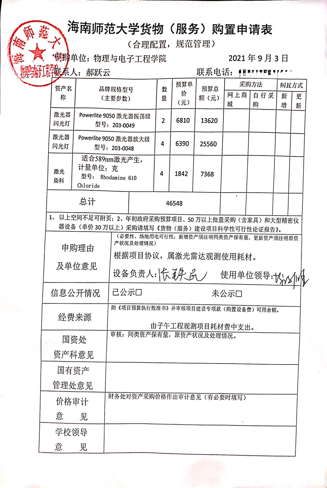 物理与电子工程学院采购激光雷达观测使用耗材公示如下,公示时间:9月9日至9月12日。