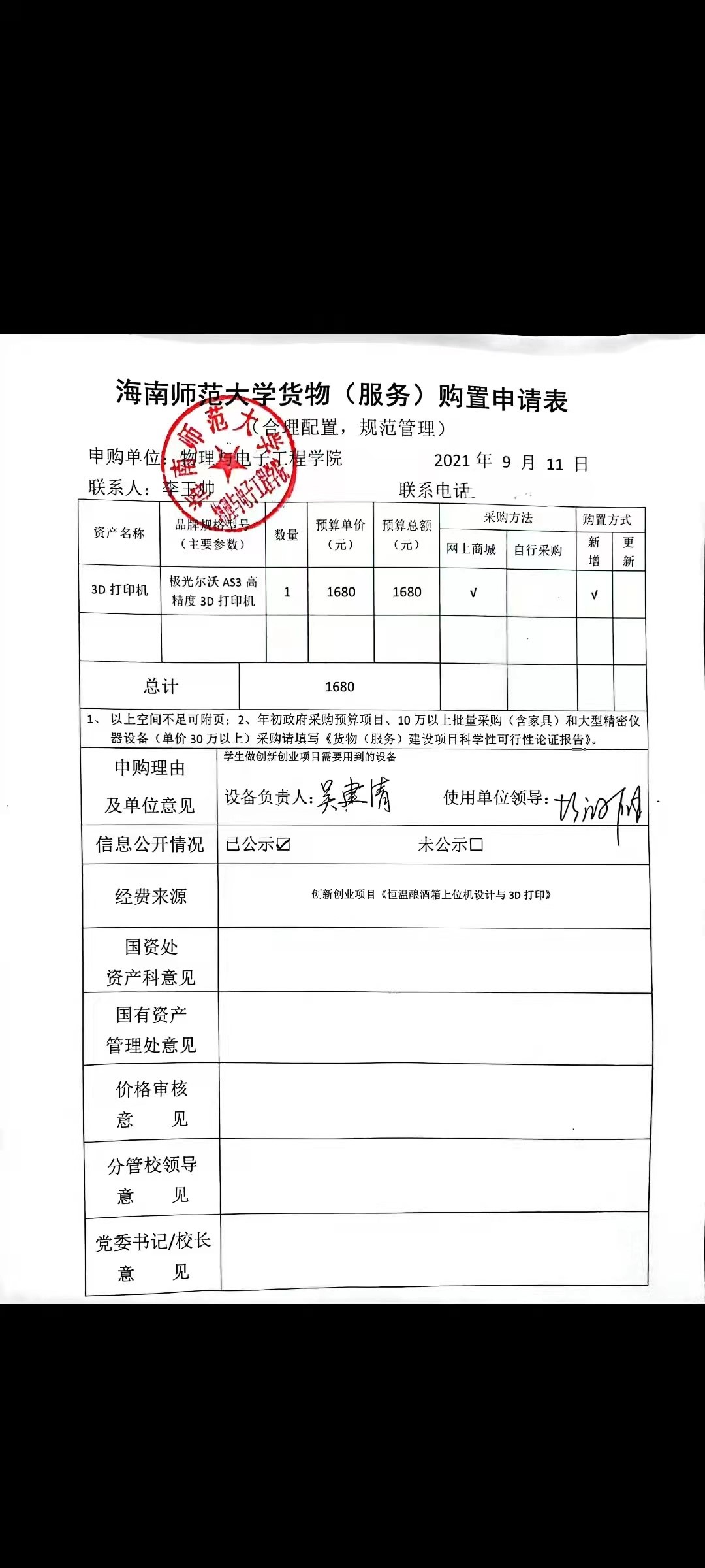 物理与电子工程学院创新创业项目,需采购3D打印机一台,公示如下。公示时间:11月15日至11月18日。