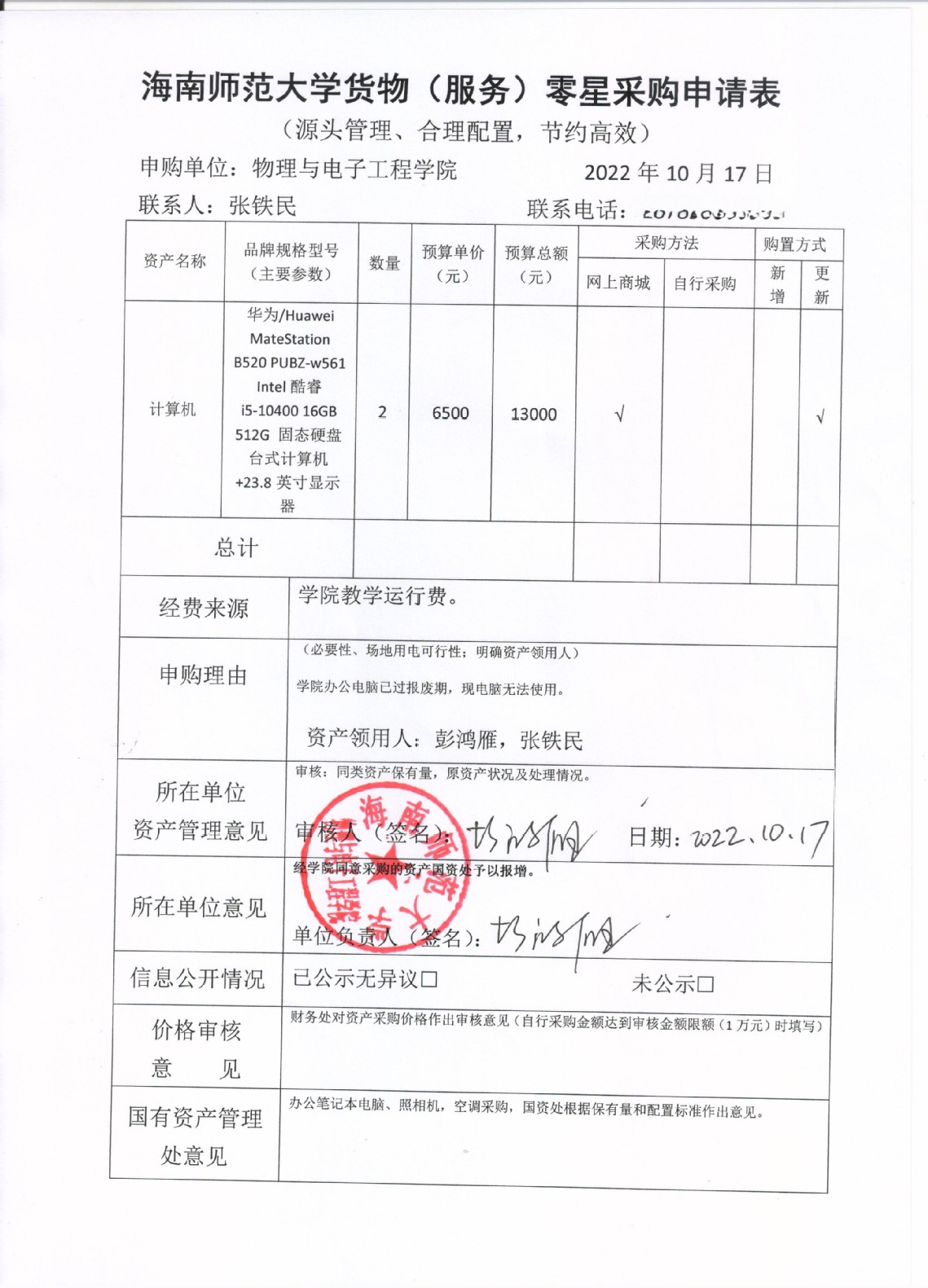 物理与电子工程学院急需采购办公电脑,公示如下,公示时间:2022年10月17日-10月20日。