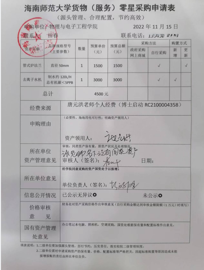 物理与电子工程学院唐元洪老师急需采购实验室设备,公示如下,公示时间:2022年11月15日-11月18日。