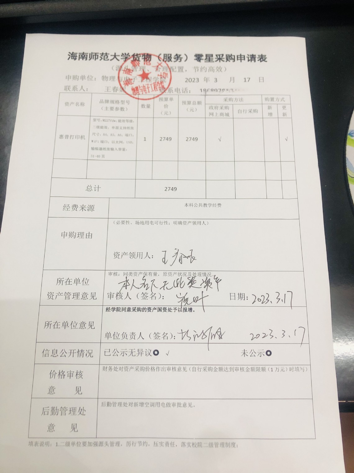 物理与电子工程学院教务与科研办公室需要采购打印机一台,公示如下,公示时间:2023年3月17日-3月20日。