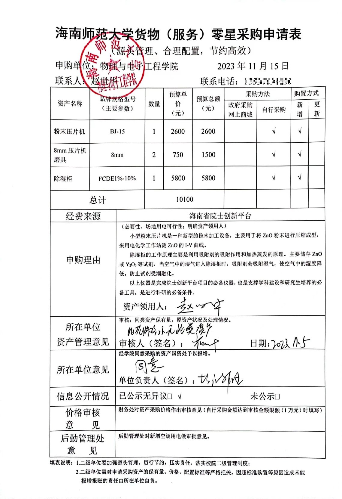 物理与电子工程学院王占国院士平台购买实验和办公设备,公示如下,公示时间:2023年11月15-11月20日。