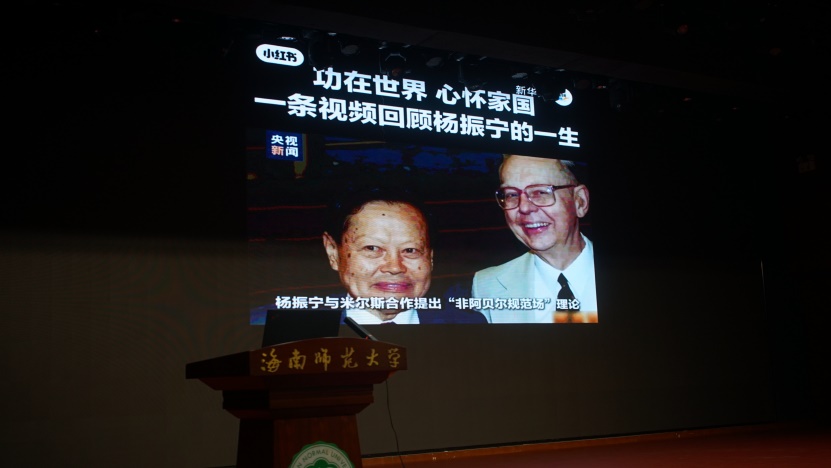 1019日,大会开幕式暨缅怀杨振宁先生活动在田家炳二楼报告厅举行,海南师范大学物理与电子工程学院院长彭鸿雁教授主持活动。现场播放了回顾杨振宁先生辉煌一生的纪念视频,全体与会人员在肃穆的氛围中集体默哀,向这位为中国科学事业和教育事业作出不可磨灭贡献的巨擘致以深切哀思与崇高敬意。