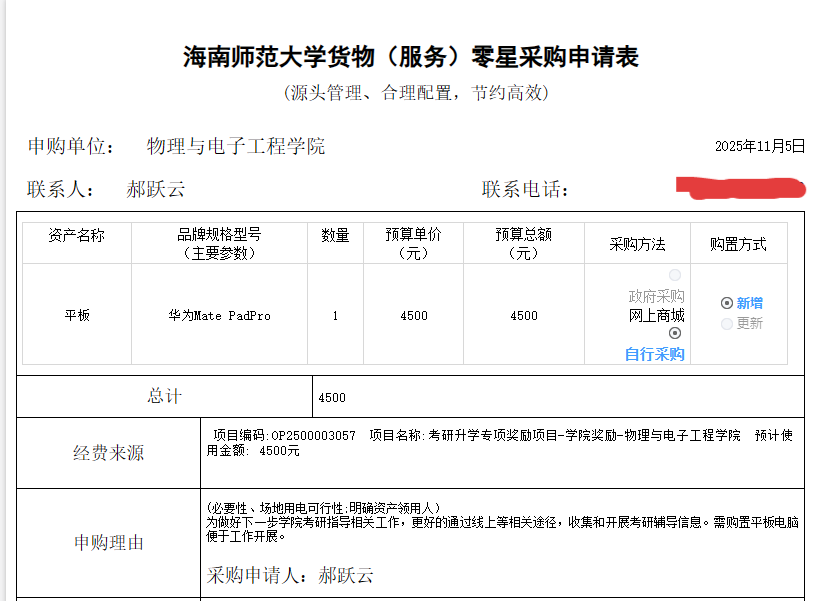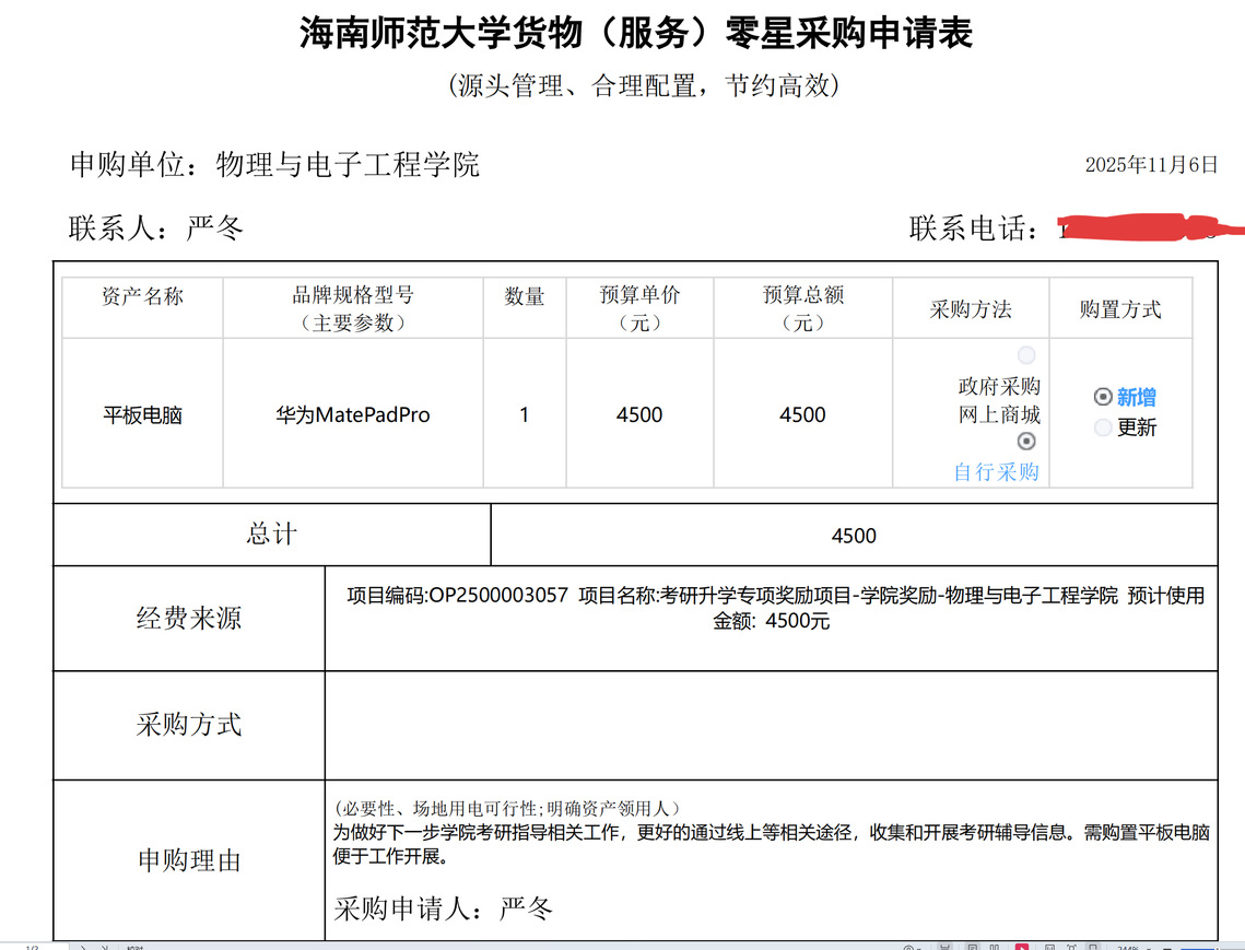 物理与电子工程学院郝跃云购买办公设备,公示如下,公示时间:2025年11月6日-11月10日。