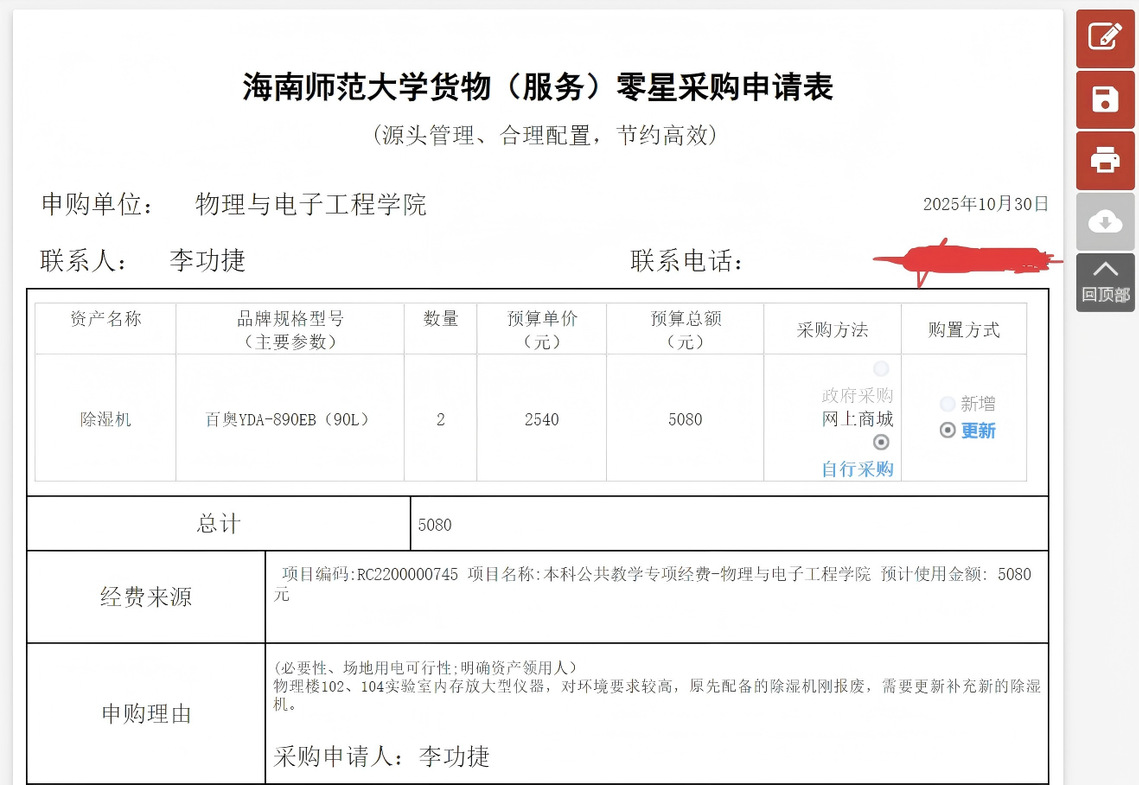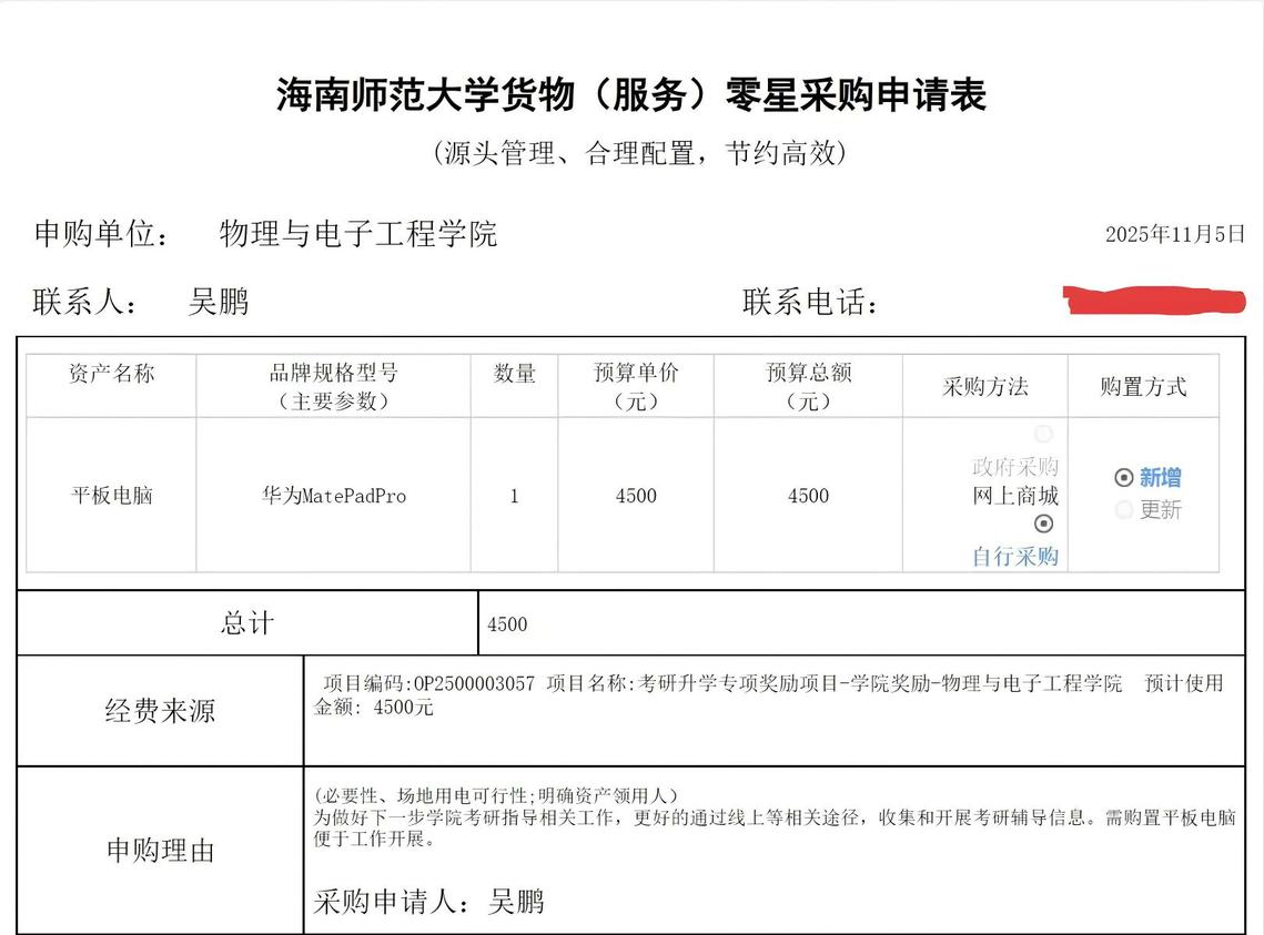物理与电子工程学院吕栋栋购买办公设备,公示如下,公示时间:2025年10月27日-10月30日。
